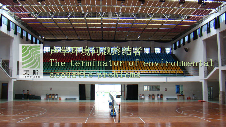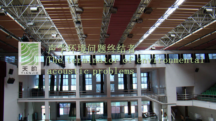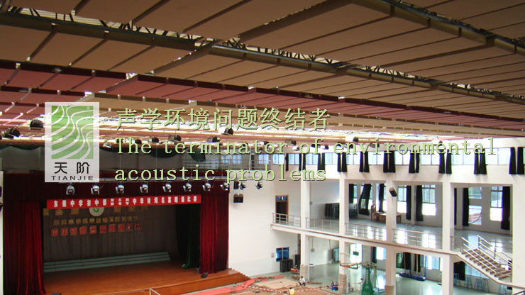 東莞中學(xué)體育館采用的是空間吸聲體。空間吸聲體是一種懸掛在頂棚具有高效吸收性能的吸聲材料。空間吸聲體一般水平或者垂直吊掛。空間吸聲體面積占頂棚面積30%-40%時(shí)其材料的吸聲性能是其他聲學(xué)材料吸聲性能的2倍。