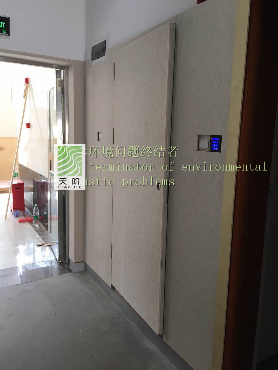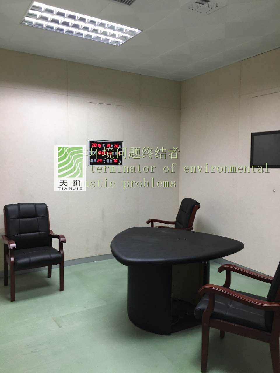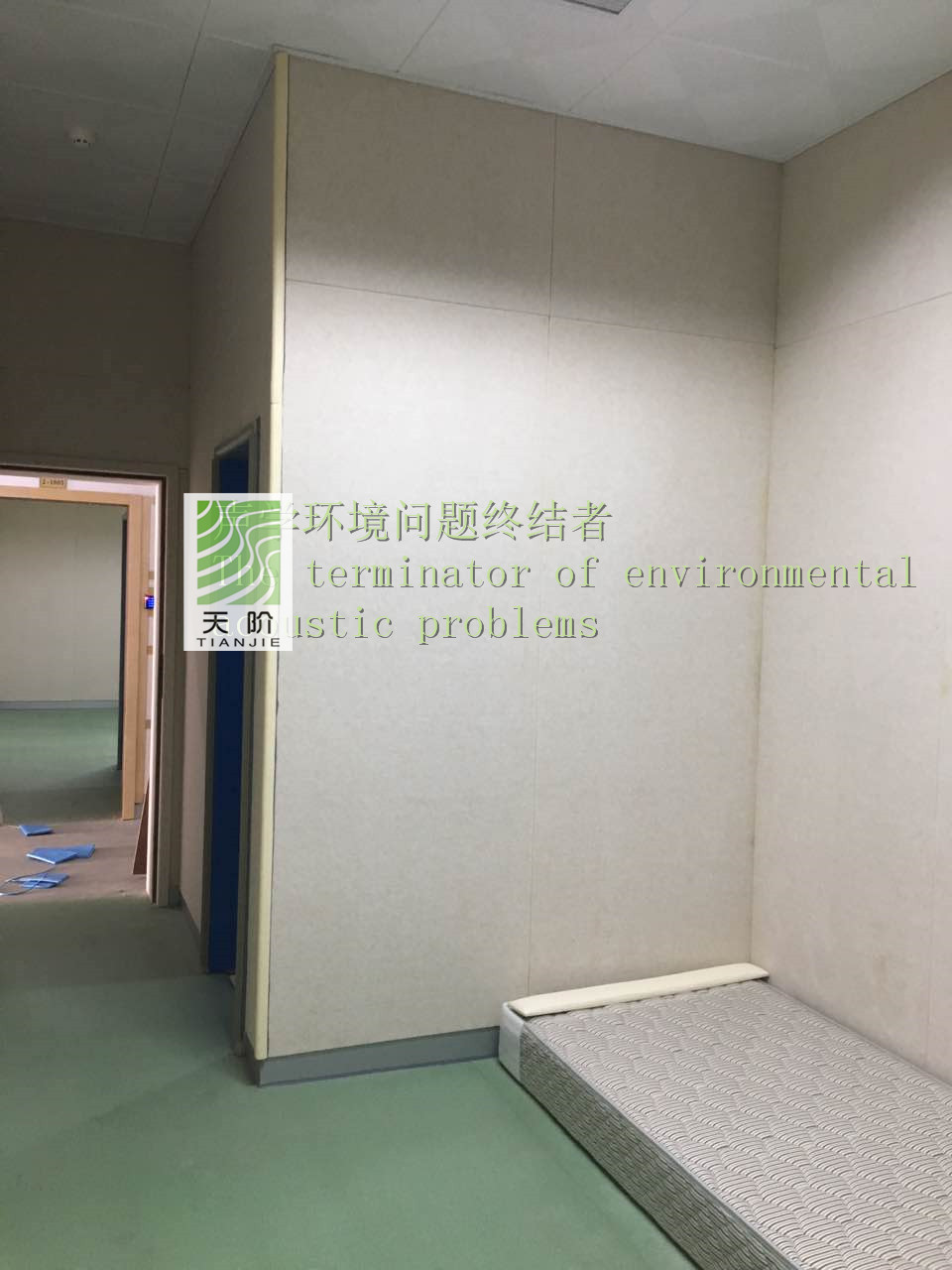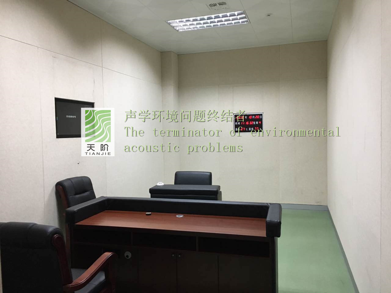 此審訊室四周都裝有聚酯纖維吸音板。為了有個(gè)更好的審訊環(huán)境,甲方要求把門也裝上了聚酯纖維吸音板。