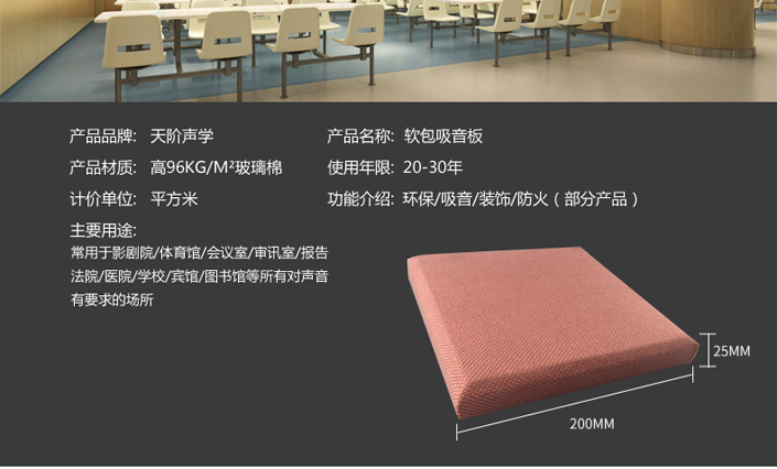 天階-防撞布藝軟包吸音板又叫吸音軟包,采用阻燃樹脂邊框或木質(zhì)邊框或鋁質(zhì)邊框內(nèi)放置,防火的特物吸聲棉,外包防火吸聲布藝或環(huán)保皮,牛皮等制成。防火處理后達到***防火GB 8624 2006 C級(同GB 8624 2012-B1級)要求。天階聲學生產(chǎn)的布藝吸音板,具有環(huán)保、防火、吸聲頻帶寬、裝飾性強、施工簡單,無粉塵污染等性能,飾面顏色及材料選擇性廣。