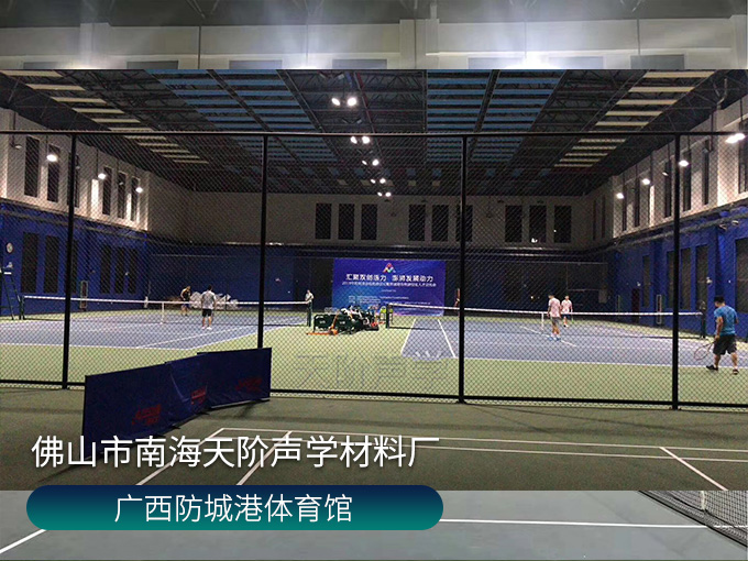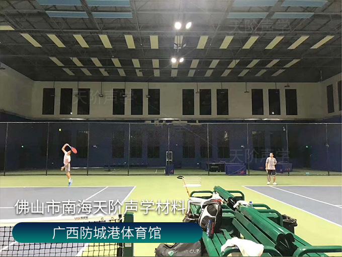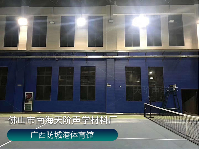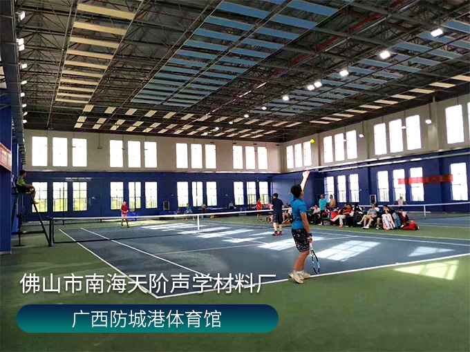 廣西防城港體育館,墻面槽木板,天花外置鋁制邊框空間吸聲體,使用平板吊頂空間吸聲體用頂部吸音裝飾;墻面選用藍色飾面的槽木吸音板,基材選用不燃的玻鎂基材,裝飾設計美觀,有出色的降噪效果。