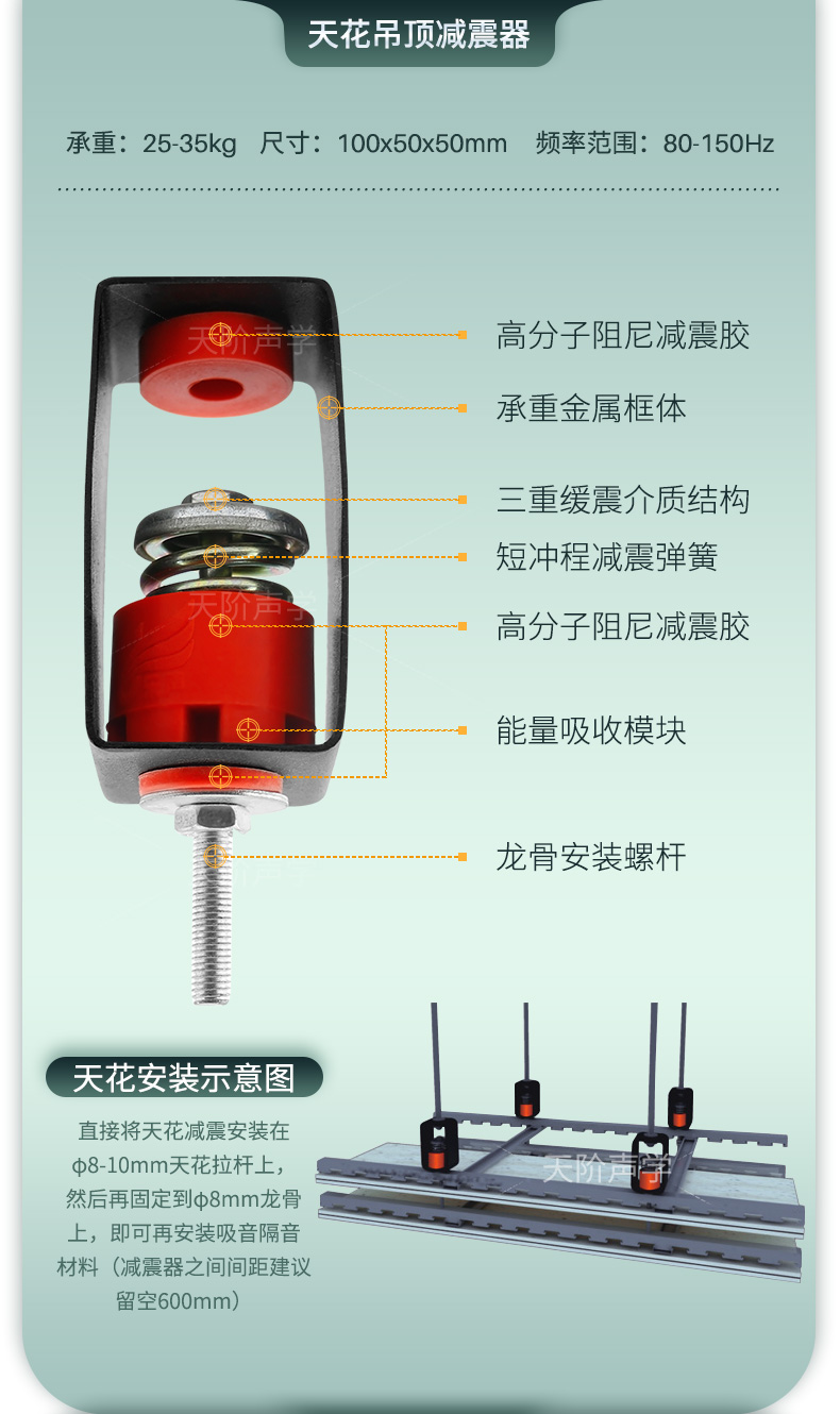 產品:吊頂減震器     承重:25kg-35kg     尺寸:100x50x50mm
