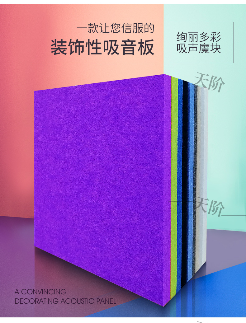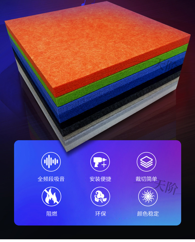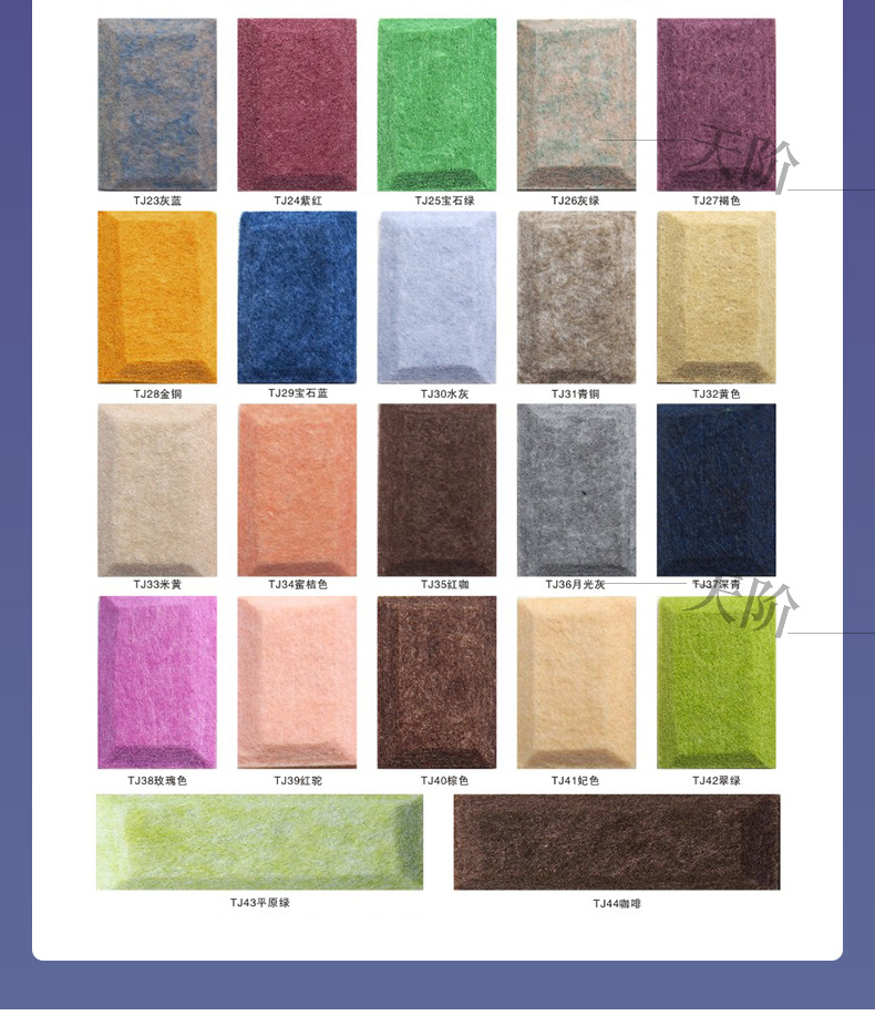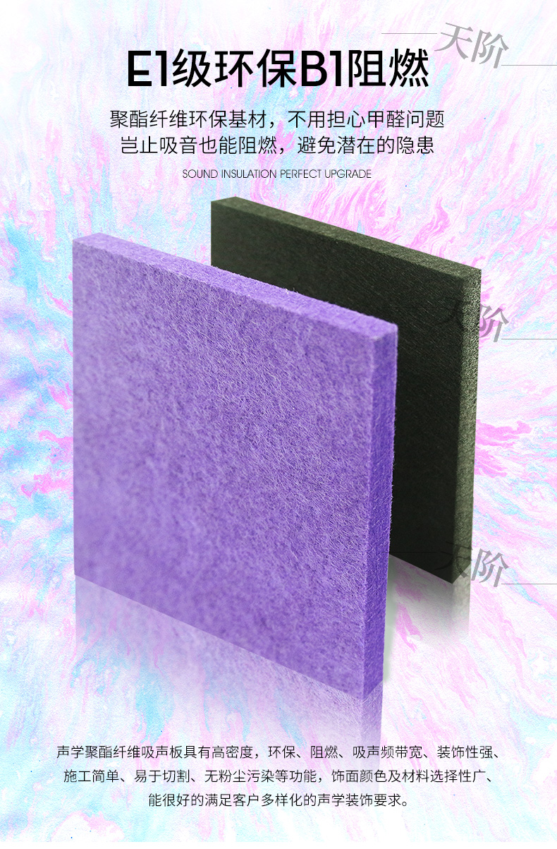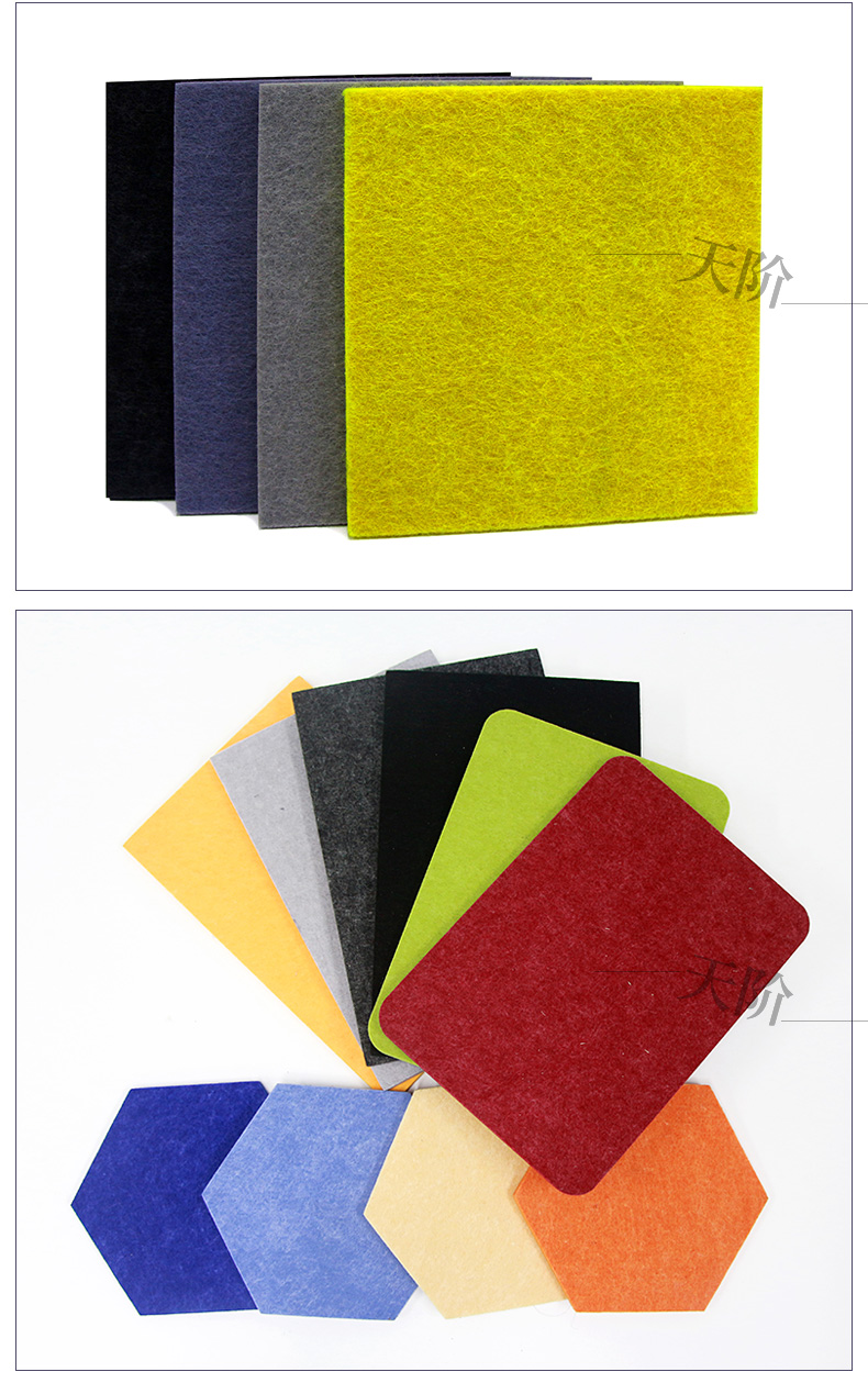 聚酯纖維吸音板又稱聚酯吸音板或纖維吸音板,是一種理想的吸聲裝飾材料。具有環保、阻燃、易除塵、易切割、可拼花、施工簡便、性價比優等特點,有多種花紋和顏色可供選擇,可滿足不同風格和層次的裝修要求。聚脂纖維吸音板在國內裝飾材料和聲學工程領域,應用非常廣泛,得到眾多國內**聲學專家的肯定與贊揚,并深受各界室內設計師、聲學設計師之信賴和選用,成為國內大部份城市的建筑聲學、產品降噪等工程的材料首選。