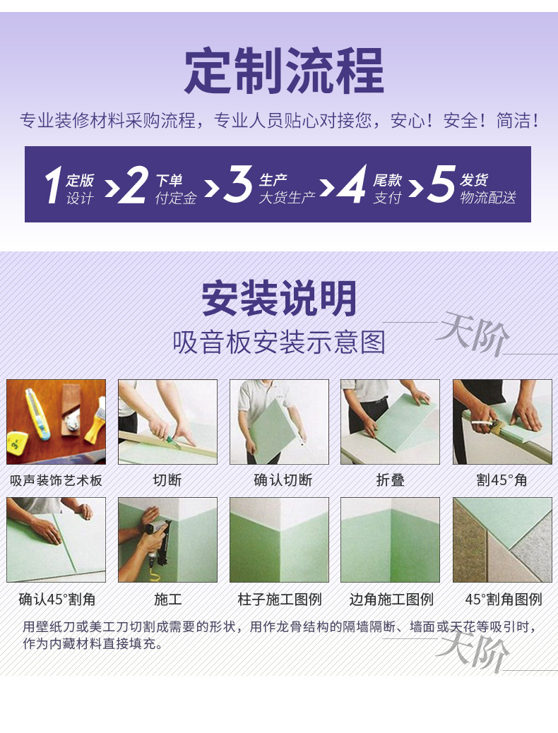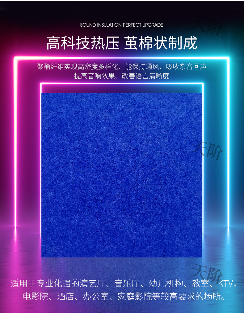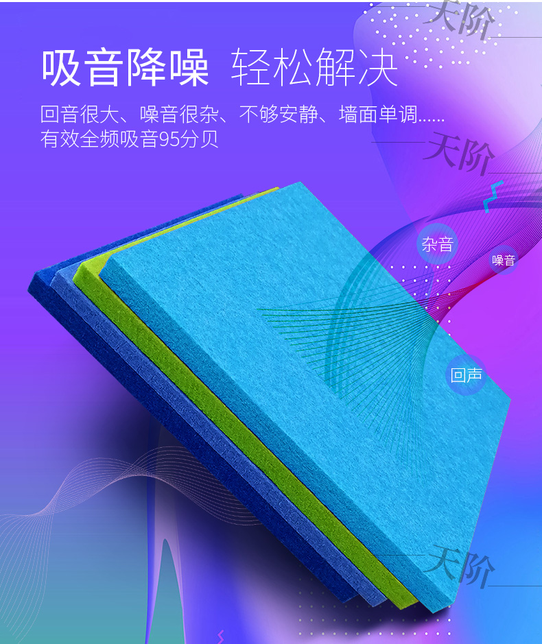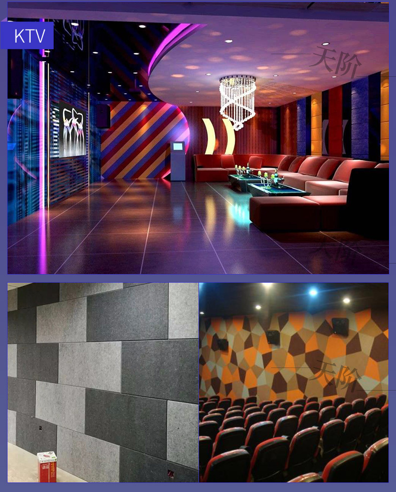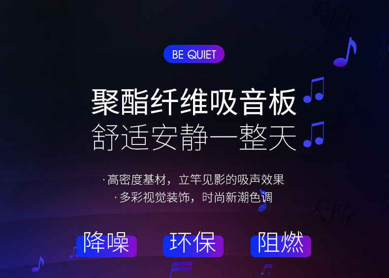 聚酯纖維吸音板又稱聚酯吸音板或纖維吸音板,是一種理想的吸聲裝飾材料。具有環保、阻燃、易除塵、易切割、可拼花、施工簡便、性價比優等特點,有多種花紋和顏色可供選擇,可滿足不同風格和層次的裝修要求。聚脂纖維吸音板在國內裝飾材料和聲學工程領域,應用非常廣泛,得到眾多國內**聲學專家的肯定與贊揚,并深受各界室內設計師、聲學設計師之信賴和選用,成為國內大部份城市的建筑聲學、產品降噪等工程的材料首選。