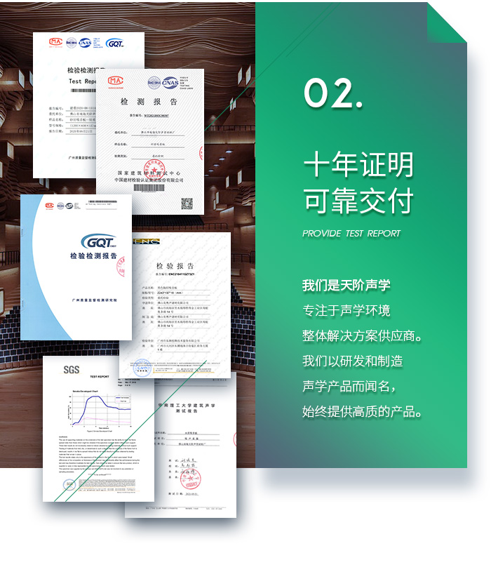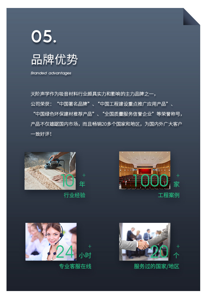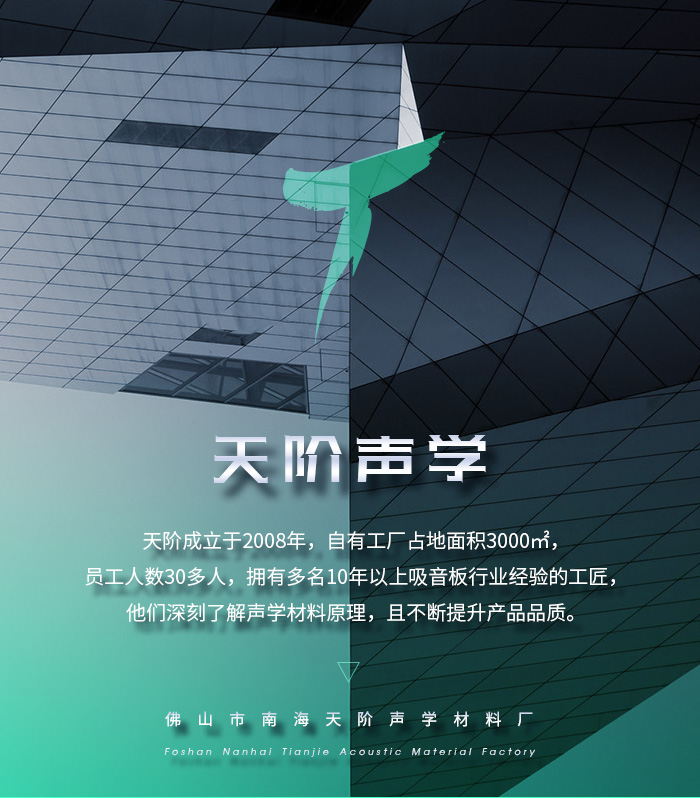 佛山市南海天階聲學材料廠作為當今中國吸音材料行業具有實力和影響的主力品牌之一,公司榮獲:中國著名品牌中國工程建設重點推廣應用產品中國綠色環保建材推薦產品全國質量服務信譽企業、等榮譽稱號,產品不僅雄踞國內市場,而且暢銷多個國家和地區,為國內外廣大客戶一致好評!
