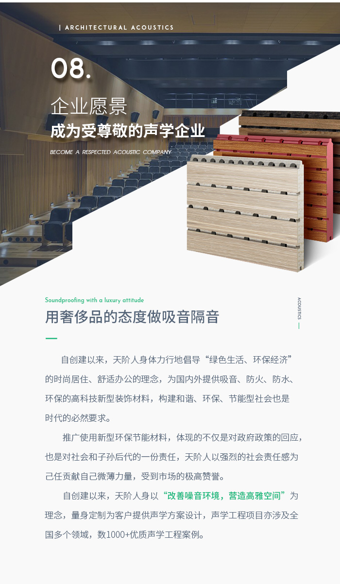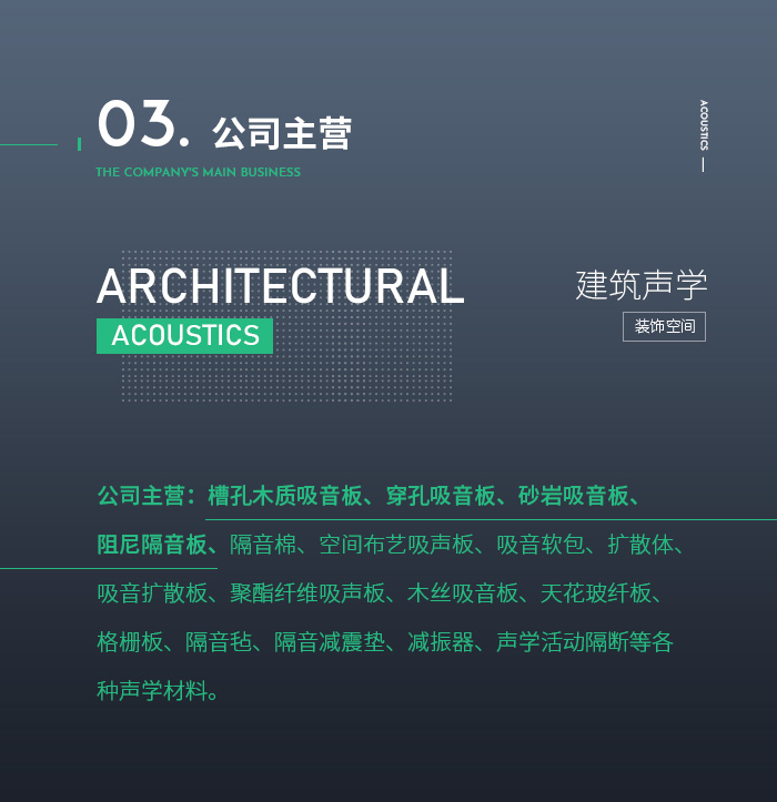 公司主營:槽孔木質吸音板、陶鋁吸音板、砂巖吸音板、布藝吸聲板、吸音軟包、微孔吸音板、碳塑吸音板、聚酯纖維吸聲板、隔音板、隔音氈、隔音減震墊、減振器,干掛板與聲學活動隔斷、固定高隔間等各種聲學材料。