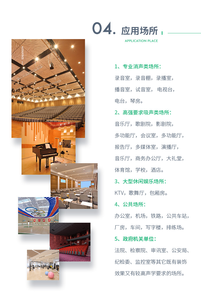 2、高強要求吸聲類場所:歌劇院,影劇院,多功能廳,會議室,多功能廳,報告廳,多媒體室,演播廳,音樂廳,商務辦公廳,大禮堂,體育館,學校,酒店。