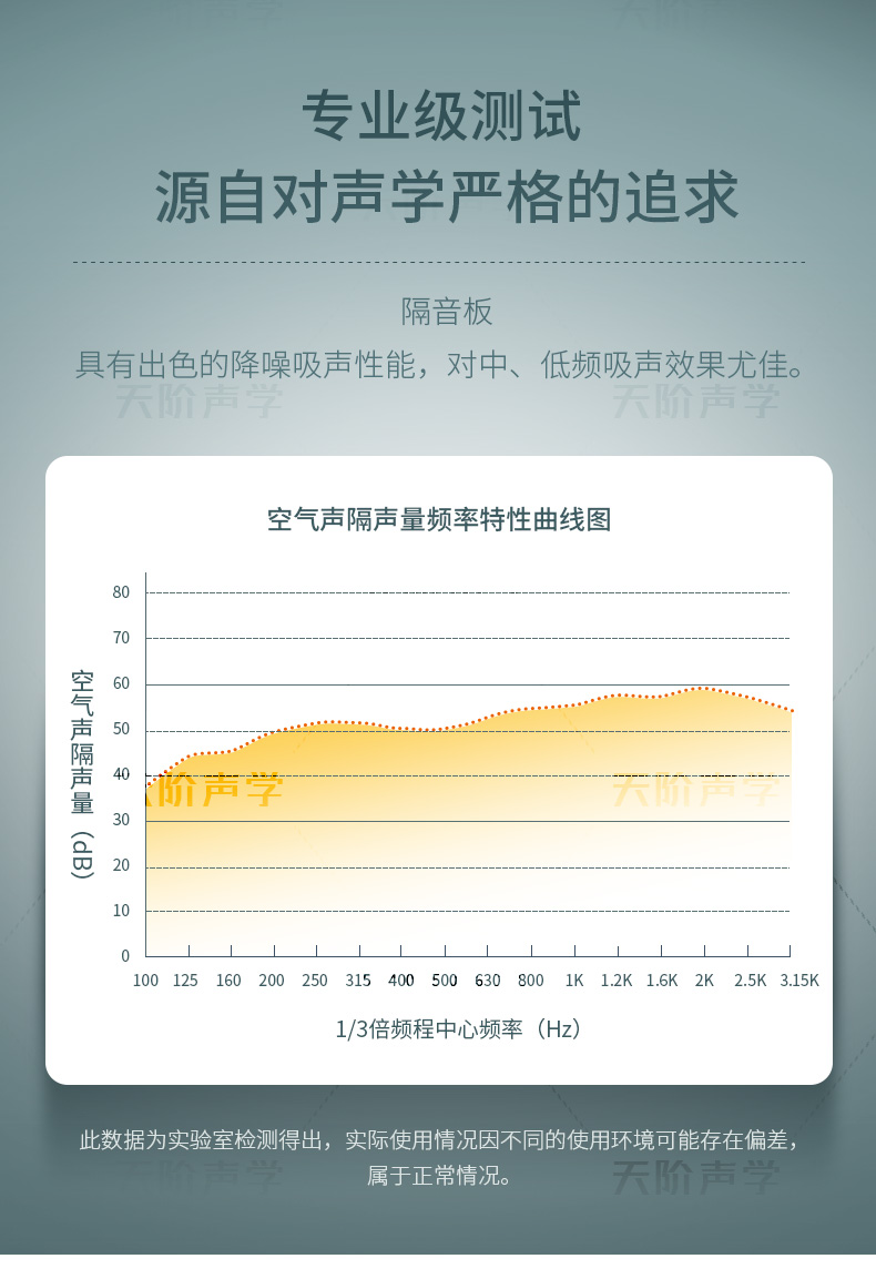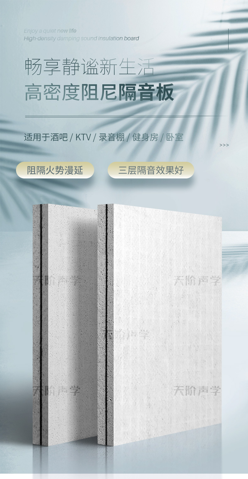 阻尼隔音板采用玻鎂基材,夾加高分子阻尼膠,三文治結構高壓復合成型,形成阻尼復合結構,改變原材質共振頻率,倍數提升原有材質空氣隔聲量和結構隔聲量。