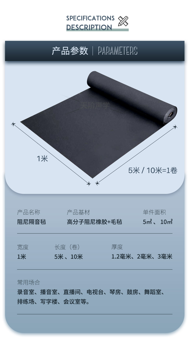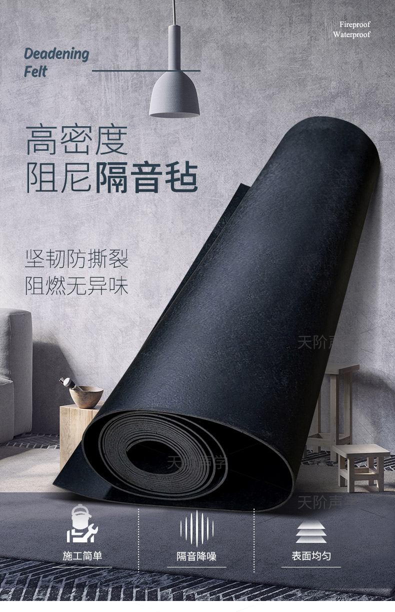 隔音氈材料質(zhì)輕、薄、柔軟、拉伸強(qiáng)度大,黑色飾面,卷材包裝;