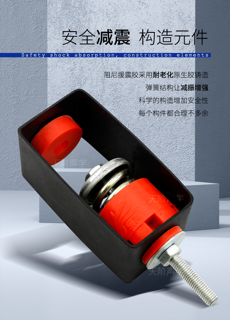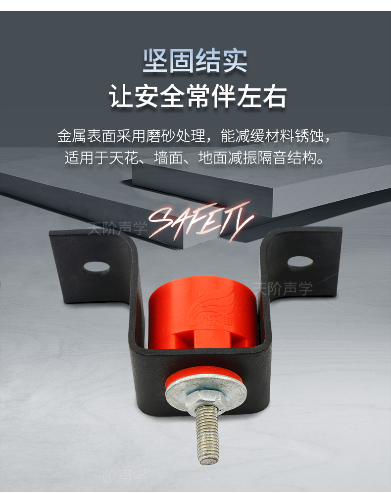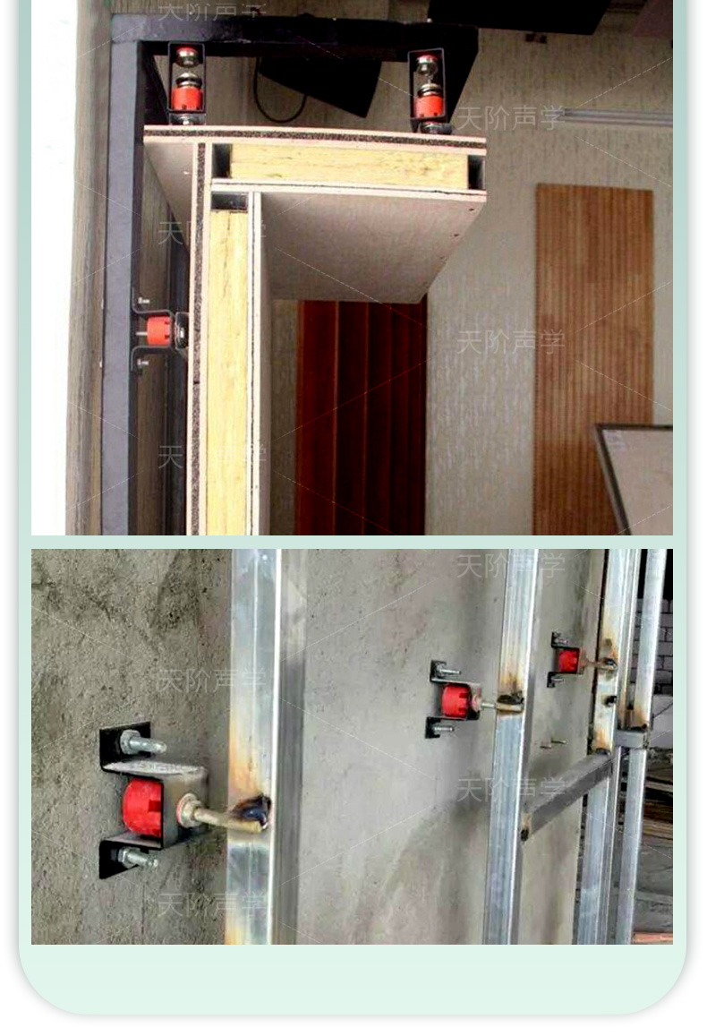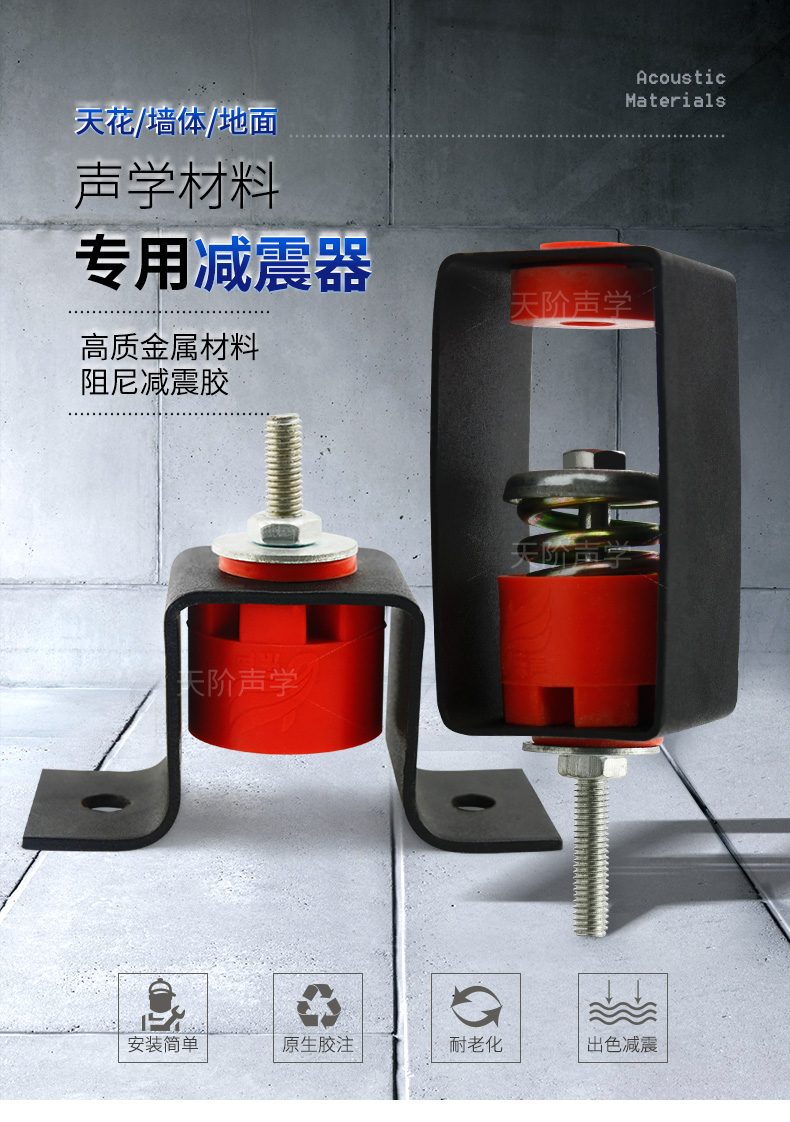 天花墻體隔音減震器是用于天花墻體隔音的必要構件。它特有的阻尼橡膠塊可以切斷聲橋的傳播,尤其對KTV、酒吧里有低音炮的地方,這是重要的隔音系統配件,不然,無論多少隔材料都無法將聲音阻隔于包廂房內。