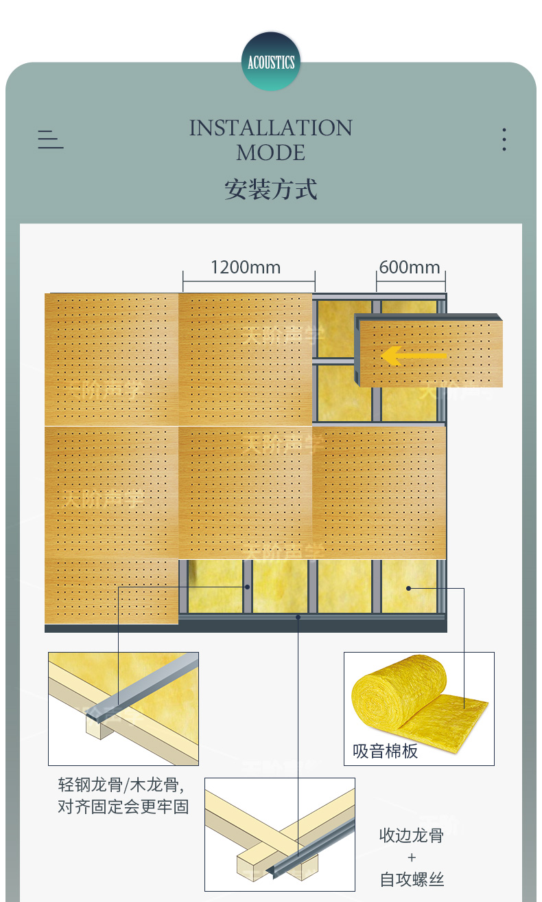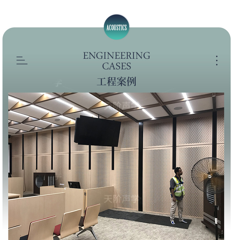 本公司專業生產木質吸音板,布藝吸聲板、吸音軟包、木絲吸音板、聚酯纖維吸聲板、蜂窩陶瓷吸音板、隔音板、空間吸聲體、擴散體、隔音材料、干掛板與聲學活動隔斷、固定高隔間等多種聲學品類。