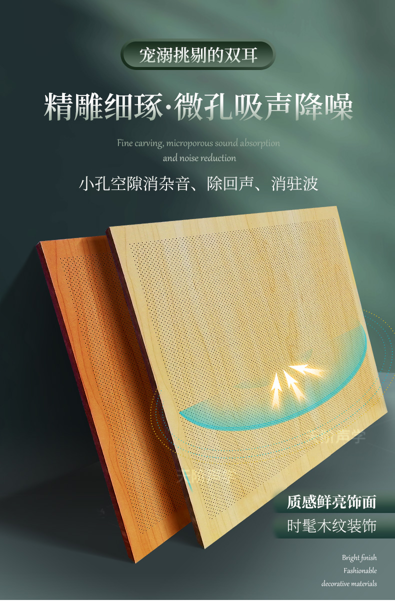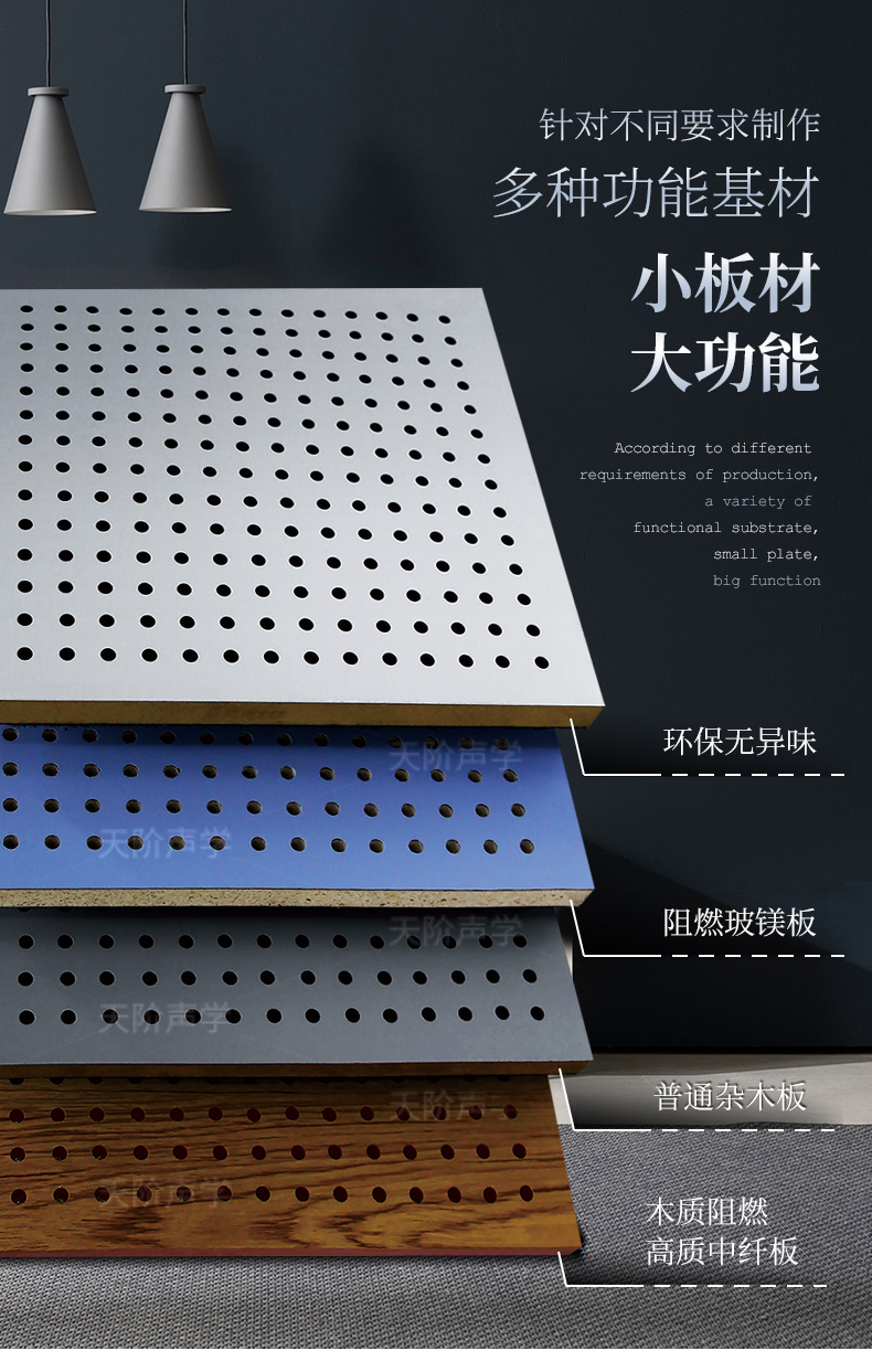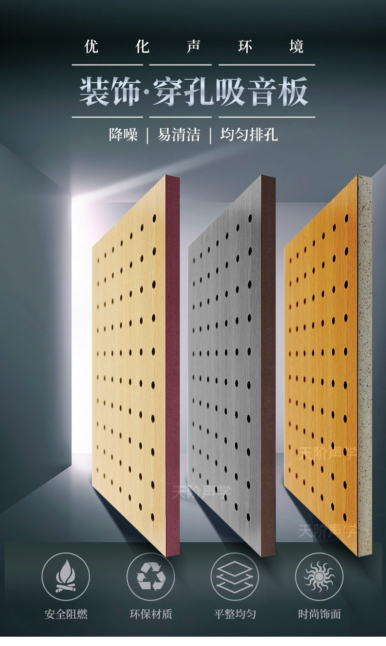 天階聲學孔木吸音板采用高質的中纖板、具有環保、防火、防潮等性能,飾面顏色及材料選擇性廣,能很好地滿足客戶多樣化的聲學及裝飾需求。較槽木吸音板,孔木吸音板相對抗撞擊能力強。