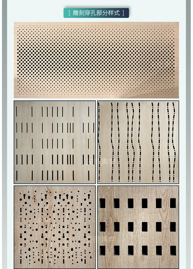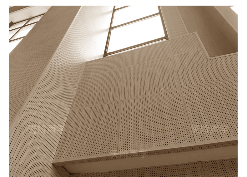 孔木吸音板是一種在密度板上直接穿孔的共振吸聲材料。孔木吸音板對吸聲頻譜選擇性較強,對低頻有很好的吸聲性能。如在吸聲結構后空腔上填入適量的吸聲棉可提高中、高頻吸聲效果。