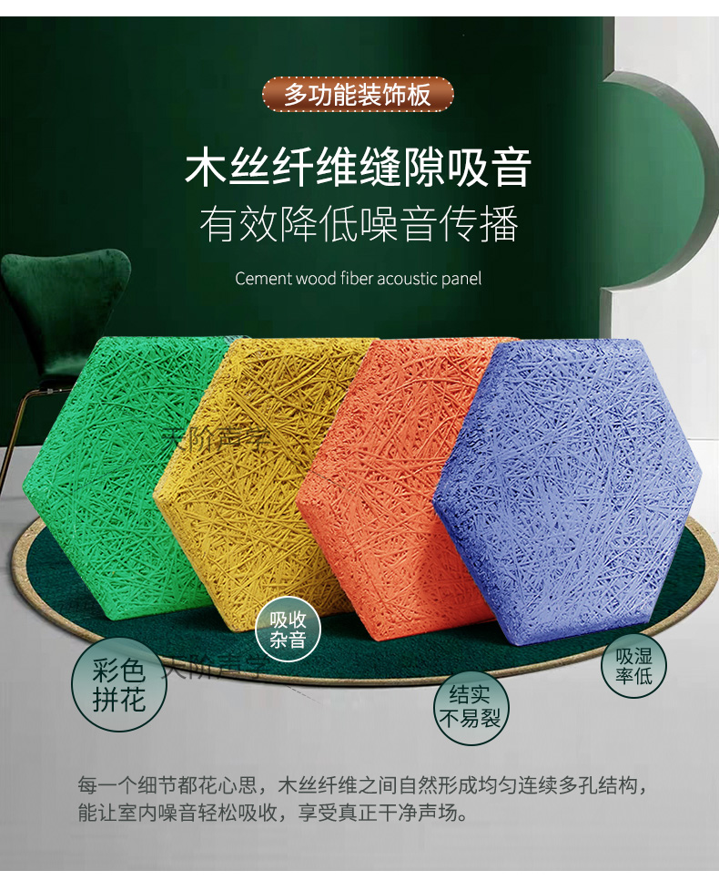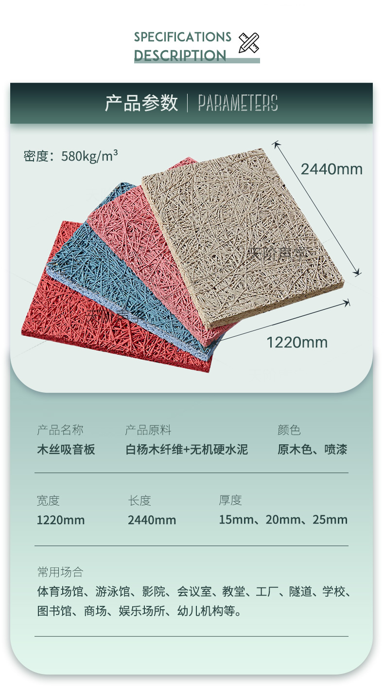 木絲吸音板的表面紋理表現(xiàn)出高雅質(zhì)感與獨(dú)特品味,可充分演繹設(shè)計(jì)師的創(chuàng)意和理念。該產(chǎn)品結(jié)合了木材與水泥的優(yōu)點(diǎn):如木材般質(zhì)輕,如水泥般堅(jiān)固,具有吸音、抗沖擊等多種功能,可廣泛應(yīng)用于體育場(chǎng)館、劇場(chǎng)、影院、會(huì)議室、教堂、工廠、學(xué)校、圖書館、游泳館等處。